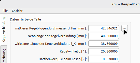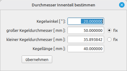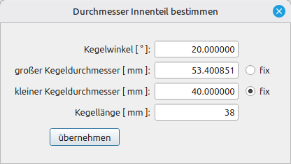 Für den hier programmierten Rechengang ist das Innenteil die Basis: Wenn anstelle des mittleren Fugendurchmessers der kleine oder der große Kegeldurchmesser des Innenteils eingegeben werden soll, so kann dies nach einem Mausklick auf den Butten neben dem Eingabefeld passieren: